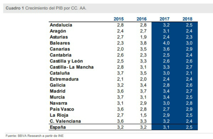 En 2017, el mayor condicionante para la revisión de las previsiones es el "decepcionante comportamiento" de las exportaciones de bienes y la inversión en maquinaria y equipo durante el segundo y tercer trimestres del año. A esto se ha unido la desaceleración tanto del sector turístico como del consumo privado. En consecuencia, las revisiones más relevantes a la baja en las previsiones de crecimiento del PIB para 2017 se dan en comunidades que comienzan a presentar un agotamiento de la capacidad instalada en el sector turístico como Balears (5 décimas), Canarias y Cataluña (3 décimas cada una), o cuyo desempeño de las ventas de bienes al exterior ha sido algo peor de lo esperado, como Galicia (también 3 décimas).