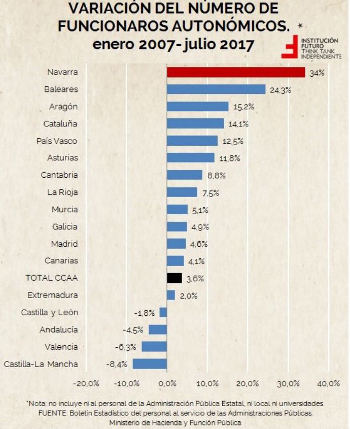 Tan sólo cuatro regiones tienen menos empleados públicos que en 2007. Castilla-La Mancha es la comunidad que más ha recortado, llegando a reducir un 8,4% el número de trabajadores autonómicos en la última década. Valencia, Andalucía y Castilla y León son las otras tres autonomías que han reducido esta cifra, 6,3%, 4,5% y 1,8%, respectivamente. En la otra cara de la moneda se encuentran Navarra, Baleares y Aragón, que han visto aumentar sus plantillas un 34%, 24,3% y 15,2%, respectivamente, en los últimos diez años.