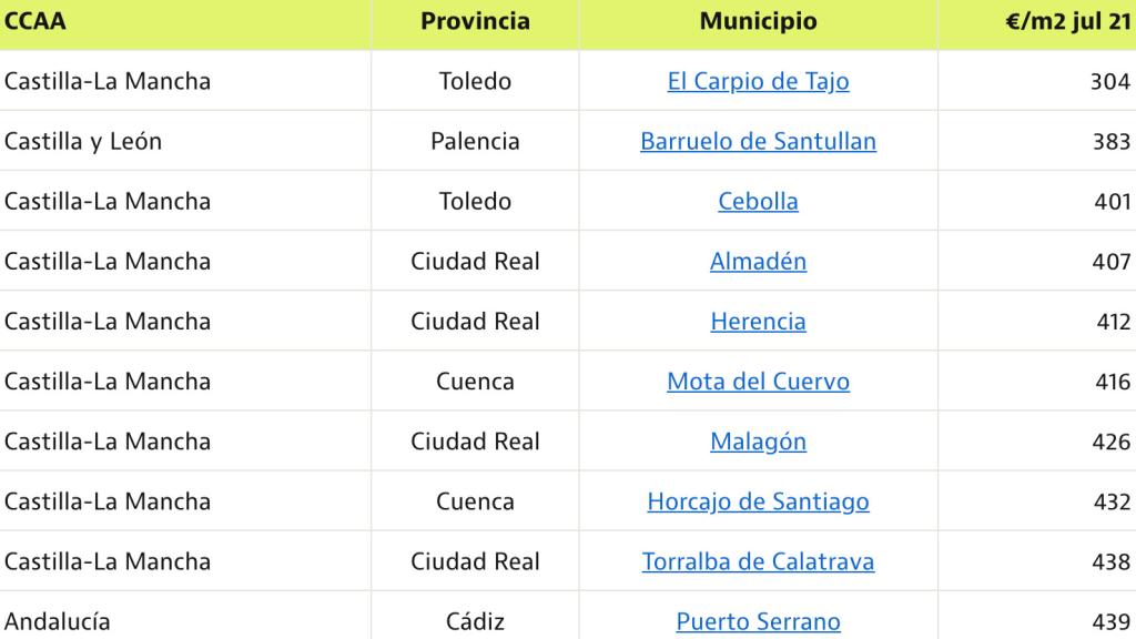 En el número dos de la lista se cuela el pueblo palentino de Barruelo de Santullán (383 euros/m2), pero le siguen otros tres municipios castellano-manchegos: Cebolla (Toledo), donde el metro cuadrado cuesta 401 euros, y las localidades de Almadén (407 euros/m2) y Herencia (413 euros/m2), situadas en la provincia de Ciudad Real. El sexto puesto lo ocupa Mota del Cuervo, en Cuenca (416 euros/m2).