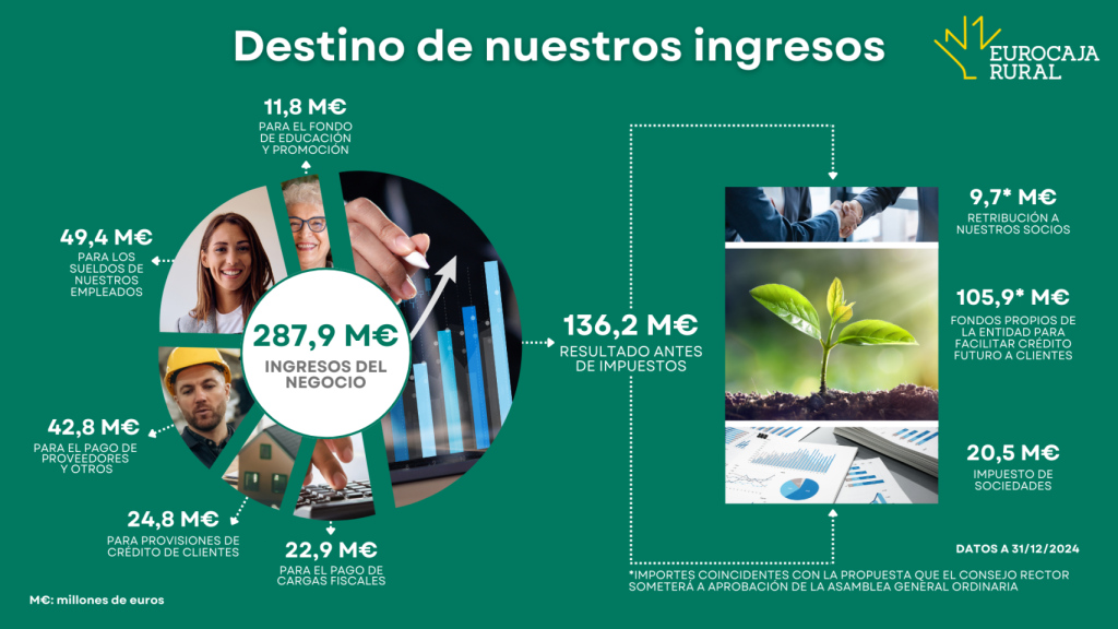 Eurocaja Rural logró en 2024 un beneficio después de impuestos de 116 millones de euros, lo que supone un crecimiento del 14,85 % respecto a 2023 y representa la cifra más alta de su historia. Antes de impuestos, el beneficio ascendió a 136 millones de euros.