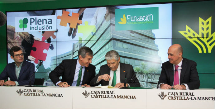 Así ha quedado plasmado en un convenio de colaboración firmado por el presidente de Caja Rural Castilla-La Mancha y su Fundación, Javier López, y el presidente de Plena Inclusión Castilla-La Mancha, Luis Perales, y su gerente, Daniel Collado, en presencia del gerente de la Fundación Caja Rural Castilla-La Mancha, Vicente Muñoz.