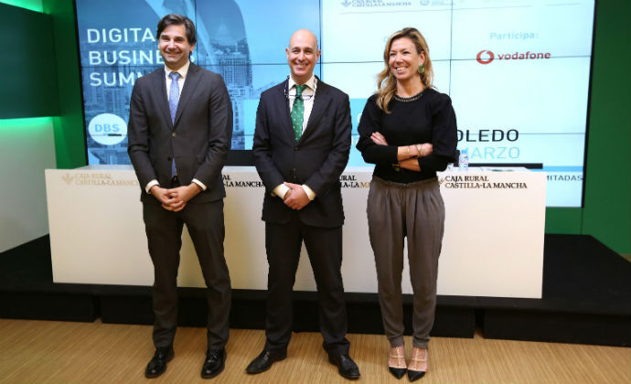 El gerente de la Fundación Caja Rural Castilla-La Mancha, Vicente Muñoz Almagro, la directora de Proyectos de ESIC Business & Marketing School, Gema Treceño Orgaz, y el director territorial para Castilla-La Mancha y Madrid de Vodafone España, Jesús Lombardero, presentaron recientemente los detalles de la 2ª edición del ‘Digital Business Summit’, el evento de innovación y negocio digital referencia en Castilla-La Mancha que se celebra este jueves 1 de marzo de 2018 con la asistencia de más de 500 personas y un buen número de ponentes y expertos de primer nivel.
