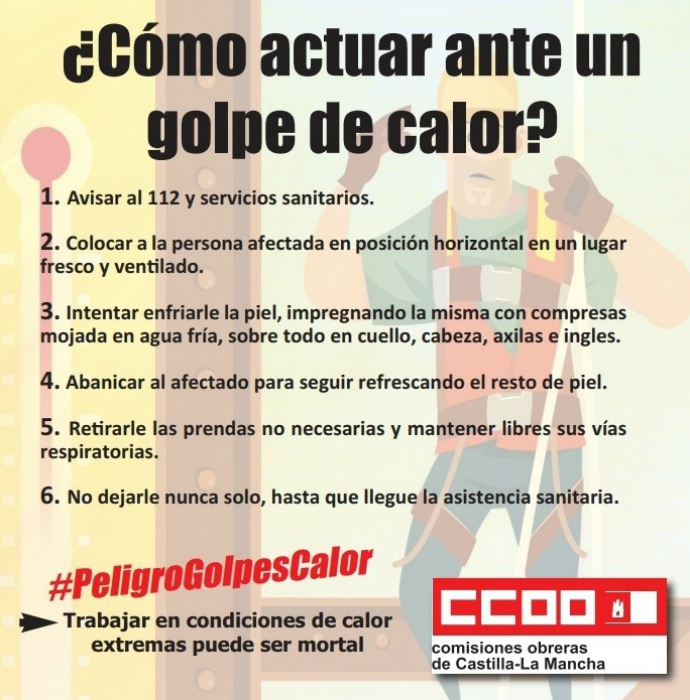 Comisiones Obreras de Castilla-La Mancha ha lanzado #PeligroGolpesCalor una campaña de información y sensibilización ante la exposición laboral al calor, con diferentes materiales gráficos y audiovisuales que se van a difundir principalmente a través de las redes sociales de Twitter, Facebook, Instagram y YouTube y a través de la web del sindicato www.castillalamancha.ccoo.es. Además, las y los técnicos de prevención de riesgos laborales van a entregar trípticos informativos en las visitas que realizan a los centros de trabajo.