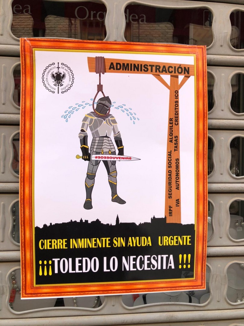 En estas circunstancias, han sido muchos los comercios de la popular calle de Santo Tomé que este domingo han amanecido con carteles en sus escaparates y cierres metálicos en los que piden ayuda a la administración con un mensaje extremo: "Cierre inminente sin ayuda urgente. Toledo lo necesita", y una armadura ahorcada y colgada sobre Toledo. En el mástil de la horca se leen términos como IVA, IRPF, Autónomos, Tasas, Seguridad Social, Alquiler... En definitiva, la pesadilla de los comerciantes, que deben hacer frente a los gastos derivados de todo ello sin tener ningún tipo de actividad ni de ingresos desde hace un año.