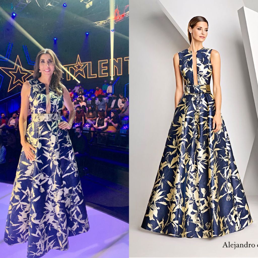 Para la gran final, Paz Padilla ha elegido un vestido largo, de color azul y con flores doradas que probablemente resulte familiar para algunas personas. Se trata de uno de los diseños que Alejandro de Miguel ha incluido en su Colección 2021 y que aparece en el catálogo de su página web. Pero, ¿a quién le sienta mejor?