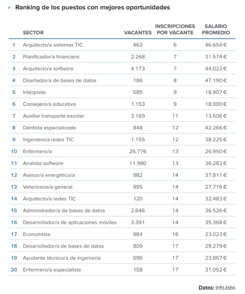 De acuerdo con los datos del Informe InfoJobs-Esade 2020 Estado del Mercado Laboral en España, Ingeniería Informática e Ingeniería de Telecomunicaciones son las dos carreras por excelencia a la hora de encontrar las mejores salidas profesionales. Y es que nueve de los veinte puestos con menor competencia en nuestro país pertenecen al sector Informática y telecomunicaciones: arquitecto/a de sistemas TIC, arquitecto/a de software, diseñador/a de bases de datos, ingeniero/a de redes TIC, analista de software, arquitecto/a de redes TIC, administrador de bases de datos, desarrollador de aplicaciones móviles y desarrollador de bases de datos.