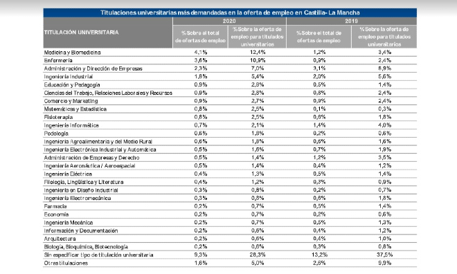 Según el informe 'Infoempleo Adecco 2020: Oferta y demanda de empleo en España', que se presentará de forma completa en unas semanas, las titulación con mayores salidas profesionales en Castilla-La Mancha es Medicina, que se alza como la carrera más solicitada por las empresas castellano-manchegas, ya que el 12,4 % de las ofertas de empleo que requieren estudios universitarios hace referencia a esta titulación. Esta demanda ha aumentado 9 puntos porcentuales en el último año (es la titulación que más ha mejorado su presencia en el ranking -cuatro posiciones-).