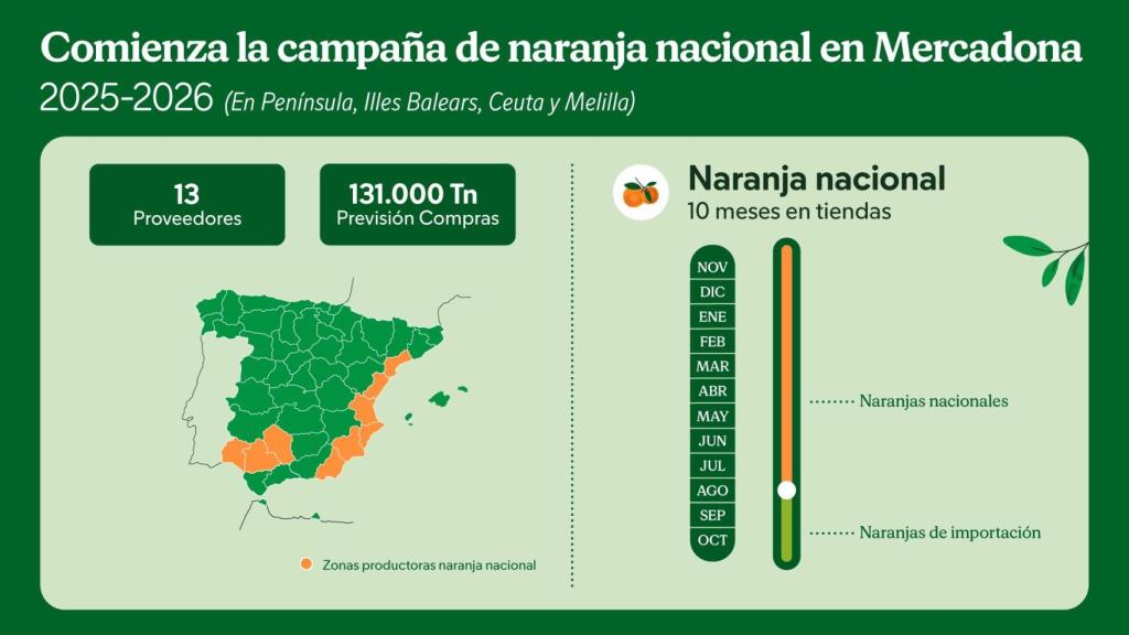 Mercadona ha arrancado la campaña nacional de la naranja, en la que prevé comercializar 131.000 toneladas de este cítrico de origen español durante la temporada 2025/2026.