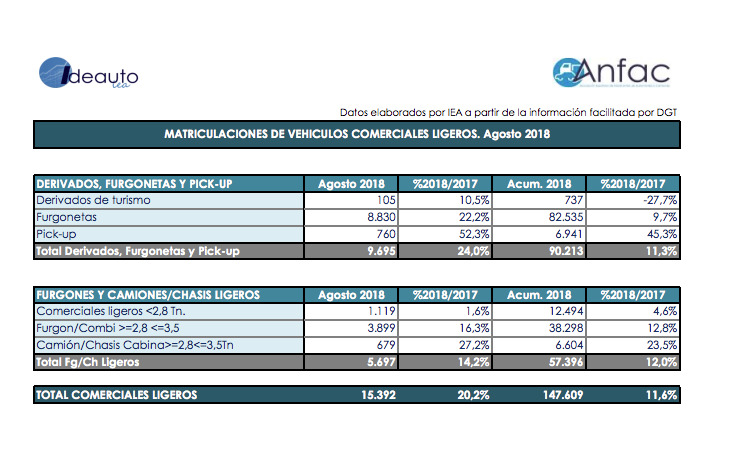 Las matriculaciones de vehículos comerciales ligeros en España alcanzaron las 15.392 unidades en agosto, lo que representa un incremento del 20,2% al compararlo con el mismo mes de2017, según datos de las asociaciones de fabricantes (Anfac), concesionarios (Faconauto) y vendedores (Ganvam)