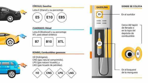 Ahora, tal como exige la nueva directiva 2014/94/UE, el tipo de combustible se distinguirá por su contenido -la gasolina se denominará E5, E10 o E85; el diésel B7, B10 o XTL; y los gases lo harán como H2, CNG o LPG- y por su forma –círculo, cuadrado y rombo, respectivamente-.