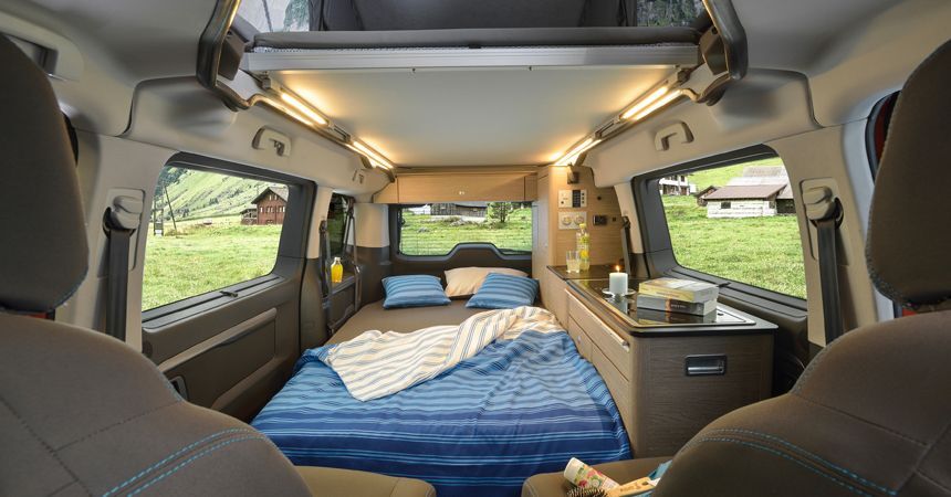 Esta mezcla de trabajo y placer alcanza nuevas cotas con el lanzamiento de sus nuevas versiones Camper, en colaboración con la empresa especializada Tinkervan, un preparador de Huesca que a través de diversos paquetes ofrece desde una simple cama con los asientos traseros a toda una pequeña vivienda con cocina, nevera, ducha y 4 plazas para dormir con su techo elevable, que además es el más alto de su clase.