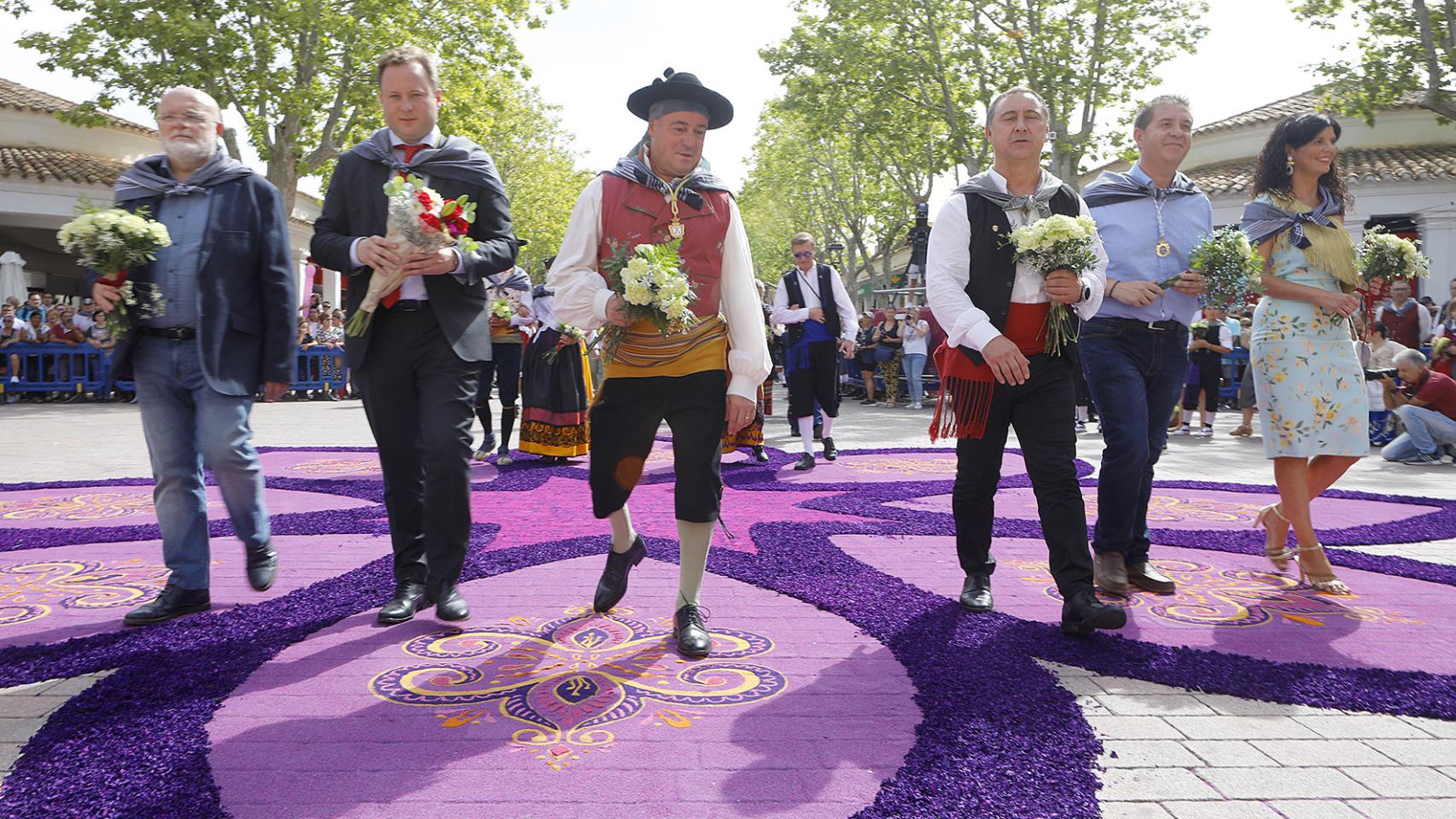 El desfile lo ha abierto la Banda Sinfónica Municipal de Albacete, junto a las autoridades y peñistas, y una vez que han depositado su ofrenda han ido colocando sus ramos de flores las distintas delegaciones participantes, entre bailes tradicionales, sobre una colorida alfombra de serrín que ha sido realizada a lo largo de toda la noche por la Asociación de Alfombristas de Elche de la Sierra. Un tapiz de figuras geométricas donde ha predominado el color violeta.