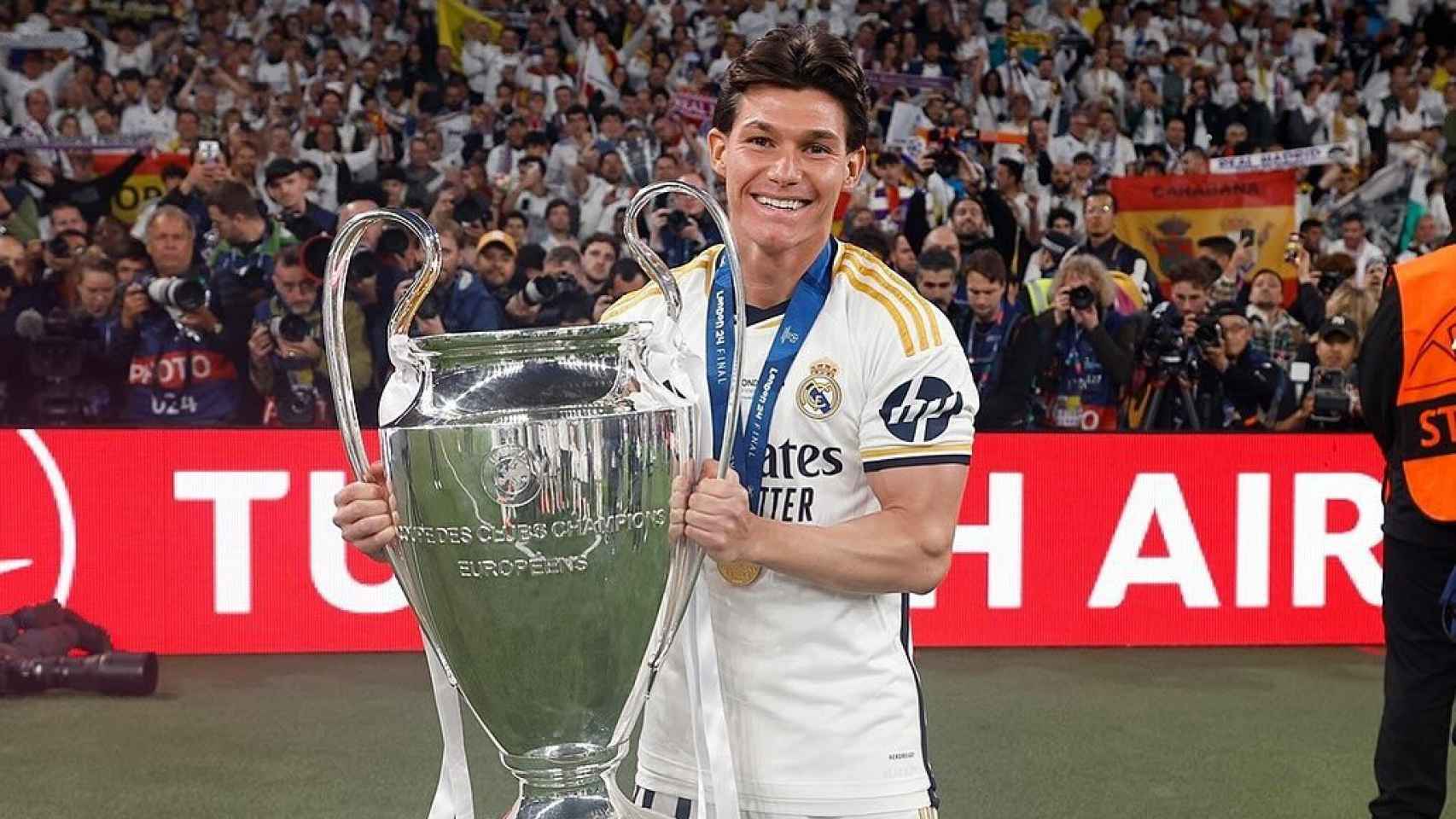 La celebración de Fran García tras conquistar la Champions con el Real Madrid