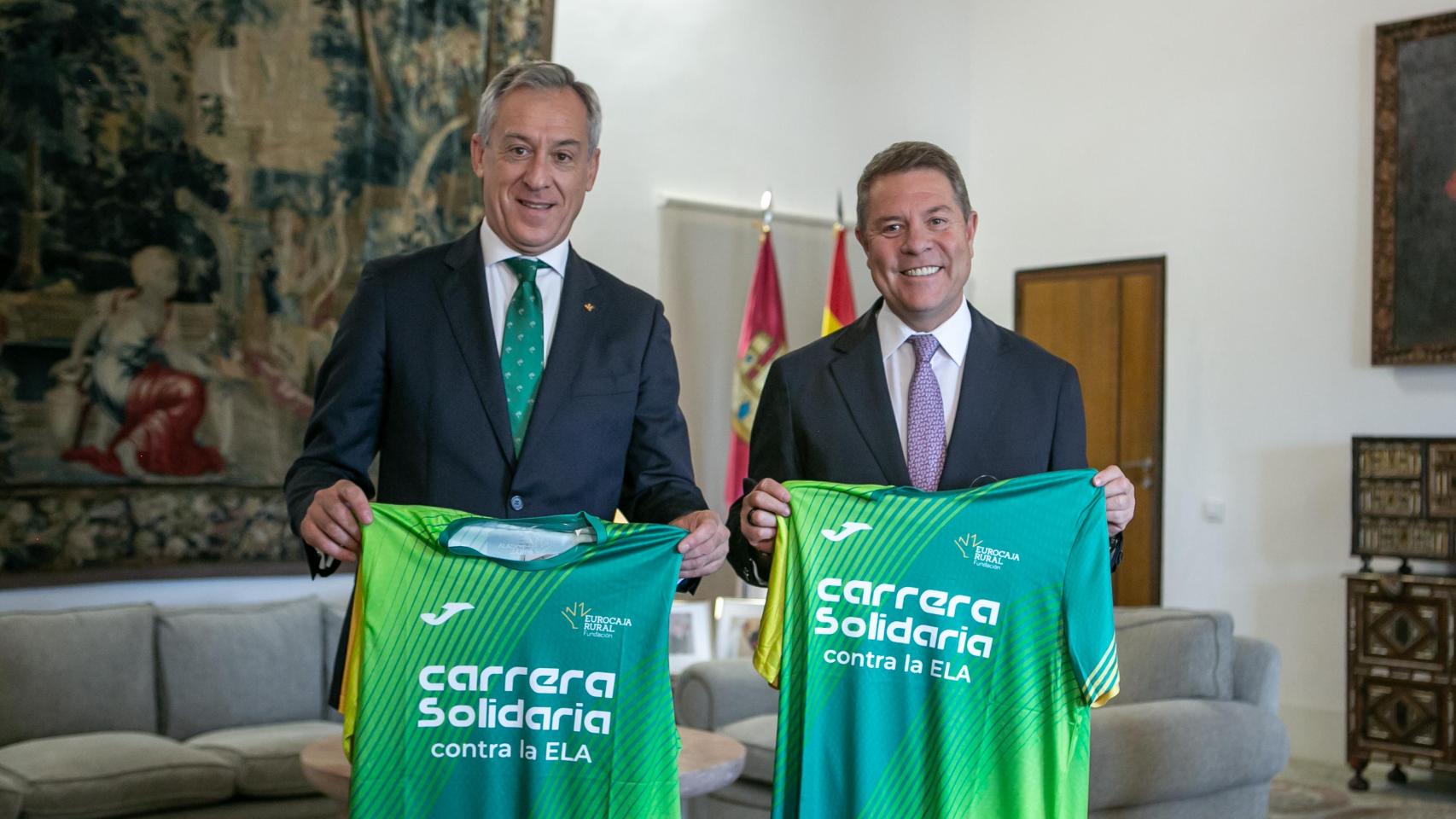 El presidente de Eurocaja Rural, Javier López Martín, ha entregado al presidente de Castilla-La Mancha, Emiliano García-Page, la camiseta de la carrera contra la ELA que se celebrará en Toledo el próximo 6 de octubre. Una cita en la que el 100 % de la recaudación irá destinada a organizaciones de todo el ámbito de actuación donde opera la entidad bancaria. En la pasada edición se agotaron las 4.000 inscripciones disponibles y se recaudaron 66.400 euros. El precio de las inscripciones es de tan solo 10 euros en las modalidades infantiles y de 12 euros en las categorías generales.