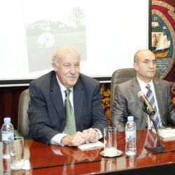 “Cuentos de fútbol” son quince relatos alrededor del deporte rey escrito por Fernando Cerezo. El libro se ha presentado esta semana y en el acto fueron protagonistas dos periodistas castellano-manchegos, además del propio autor y el exseleccionador nacional Vicente del Bosque. Uno de esos periodistas es el toledano Juan Pablo Merino (en la imagen, 2i), responsable de Comunicación de Aqualia, empresa en la que trabaja también el autor de libro y cuya colaboración ha sido fundamental para poder llevar a cabo la publicación. El otro es el ciudadrealeño Manuel Juliá (en la imagen, 1d en la mesa), periodista, escritor, poeta y director gerente de la feria del vino más importante del país, Fanavín. Juliá ha escrito el prólogo de “Cuentos de fútbol”.