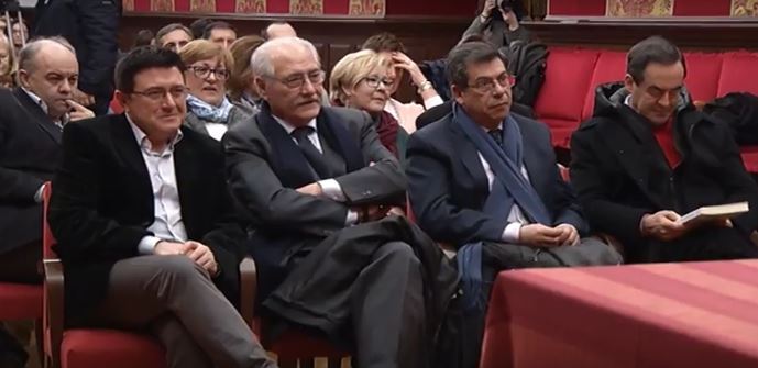 El expresidente de Caja Castilla-La Mancha Juan Pedro Hernández Moltó se dejó ver el lunes en Toledo en un acto público celebrado en el ayuntamiento de Toledo en el que se presentó el libro de los periodistas Fernando Jáuregui y Federico Quevedo “El desengaño”. Dirigió las intervenciones Milagros Tolón, como anfitriona y alcaldesa de la ciudad, y presentó a los autores y moderó las intervenciones la periodista Esther Esteban, coeditora de EL DIGITAL CLM y compañera de Jáuregui y Quevedo en pasadas y actuales tertulias de radio y televisión.