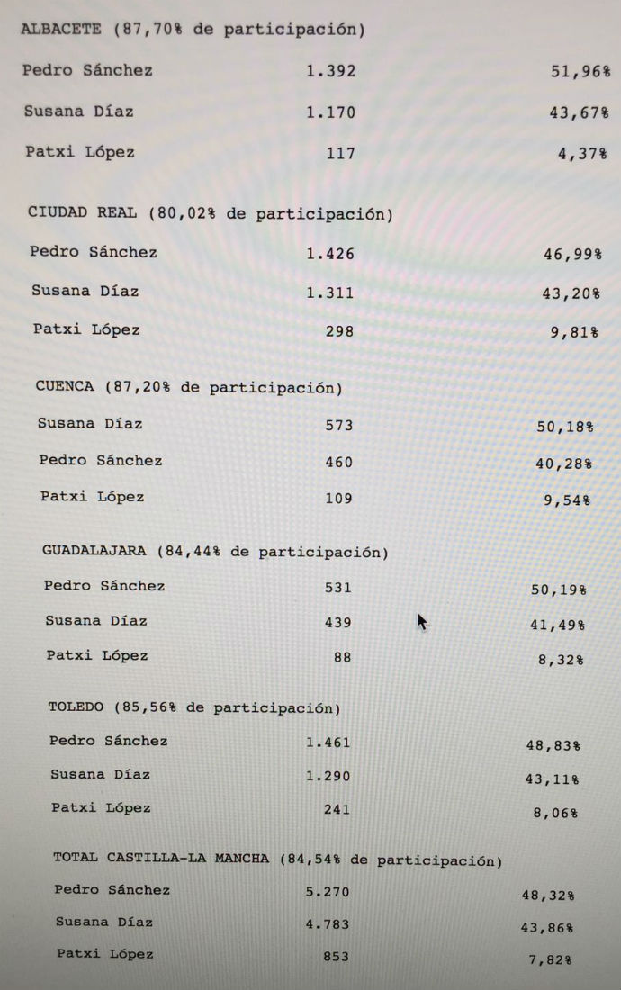 El ex líder del PSOE Pedro Sánchez ha ganado las primarias socialistas en Castilla-La Mancha con el 48,32 por ciento del voto, mientras que la presidenta andaluza Susana Díaz ha logrado el 43,86 por ciento de apoyos y el ex lehendakari Patxi López, el 7,82 por ciento de votos.