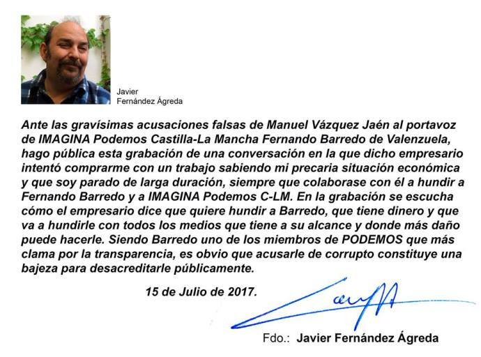 En la misma cuenta de Facebook de la esposa del empresario se publica esta imagen de un documento firmado por Javier Fernández Ágreda en el que asegura que Manuel Vázquez intentó comprarle y que así queda reflejado en la grabación. Asegura que en la grabación se escucha cómo el empresario afirma que quiere hundir a Barredo con todos los medios que tiene a su alcance.