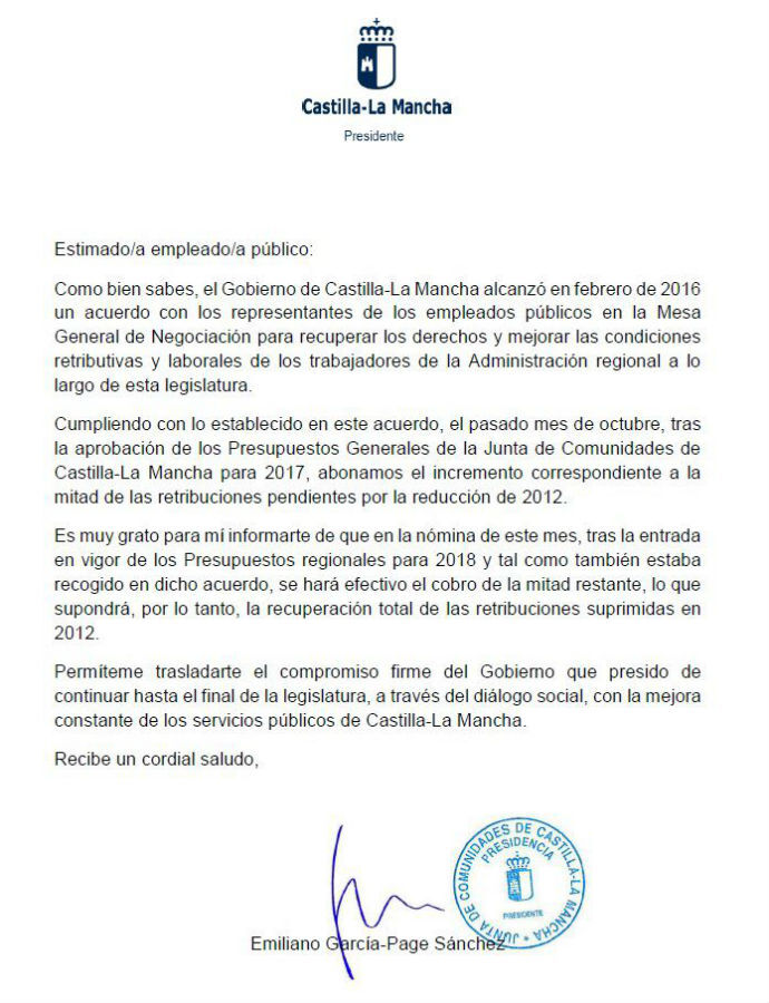 La carta con la que Page ha dado una alegría a los empleados públicos de Castilla-La Mancha