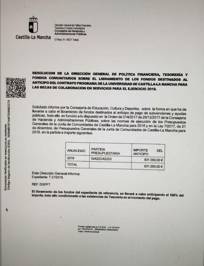 El Gobierno de Castilla-La Mancha ha hecho efectivo un anticipo por valor de 831.000 euros solicitado por la Universidad regional (UCLM) para hacer frente al pago de becas de colaboración, pese a que no se ha suscrito todavía el contrato-programa vinculado a la financiación de la institución académica.