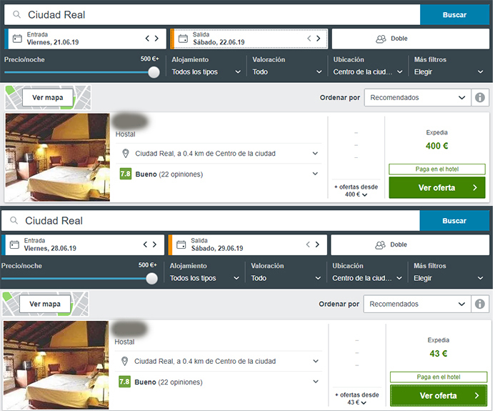 En Ciudad Real todavía quedan habitaciones disponibles, pero a precio de oro. No en vano, sólo aparecen dos referencias en la capital y una de ellas ha llegado a multiplicar casi por 10 su precio habitual. De este modo, dormir en el mismo núcleo urbano del centro en el que los opositores deberán examinarse cuesta hasta 400 euros esa noche del 21 de junio, cuando una semana después se podrá pernoctar en ese mismo hostal al precio de 43 euros, como se puede apreciar en la imagen inferior.
