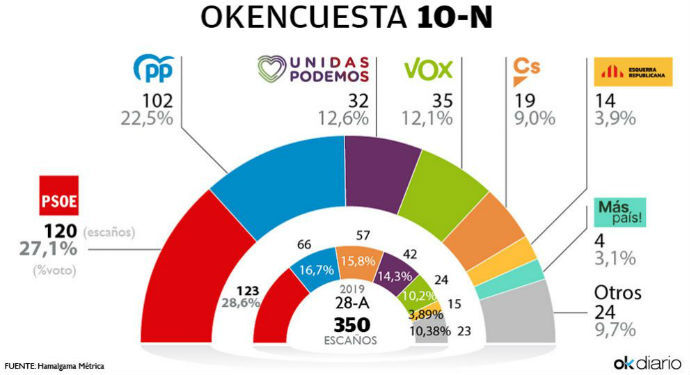 La de El Mundo no es la única encuesta electoral que se publica este jueves. El Partido Popular dePablo Casadoarrancará lacampaña electoralen la noche de este jueves a sólo 18 escaños del PSOE dePedro Sánchez, según la encuestaelaborada por Hamalgama Métrica para OkDiario. De celebrarse las elecciones hoy, lospopularesobtendrían 102 diputados (22,5%), frente a los 120 de los socialistas (27,1%).