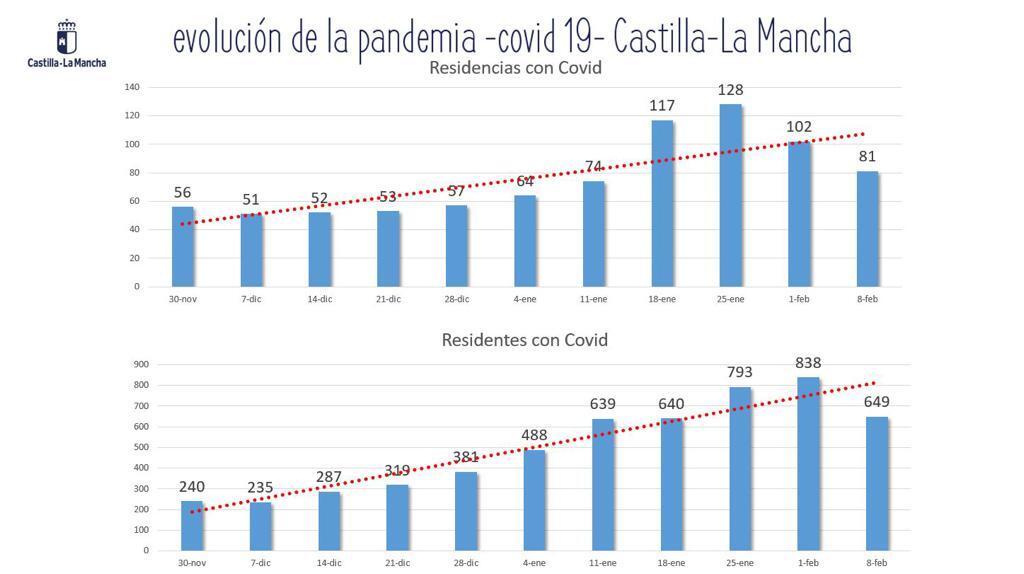 Según los datos semanales ofrecidos por el Servicio de Salud de Castilla-La Mancha consultados por Europa Press, en el caso de las residencias de mayores, a fecha de este lunes había un total de 81 con algún caso positivo, lejos de las 128 que se alcanzaron el lunes 25 de enero, y dato similar a las 74 del 11 de enero.