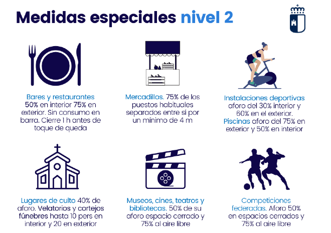 Así, hasta 36 localidades castellano-manchegas se encuentran en nivel 3, lo que implica, entre otras medidas (pueden consultarse aquí), el cierre del interior de los locales de hostelería y restauración, la restricción del aforo de supermercados y centros comerciales a un tercio, la prohibición de las visitas en las residencias de ancianos o la limitación a 6 personas en los velatorios y funerales.