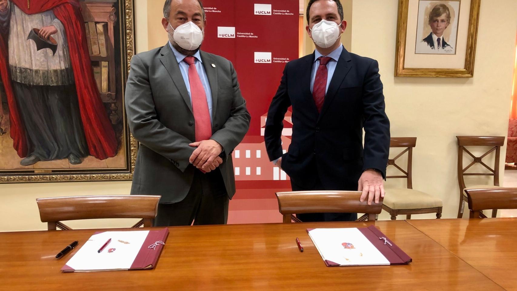 El rector de la Universidad de Castilla-La Mancha (UCLM), Julián Garde; y el decano del Colegio Notarial de Castilla-La Mancha, Luis Fernández-Bravo, han firmado en la sede del Rectorado en Ciudad Real el acuerdo que renueva la colaboración entre ambas instituciones para el presente año. Al amparo de este acuerdo, entre las actividades previstas figura la financiación de un contrato de investigación en el Centro de Estudios de Consumo de la Universidad regional y la organización conjunta de un curso de verano. Además, la entidad notarial celebrará seminarios de Derecho Notarial gratuitos para los estudiantes de todos los campus y volverá a abonar el Premio Ilustre Colegio Notarial de Castilla-La Mancha para Trabajos de Fin de Grado de Derecho Privado, que incluye un primer premio dotado con 500 euros y otro de 300 para el finalista.