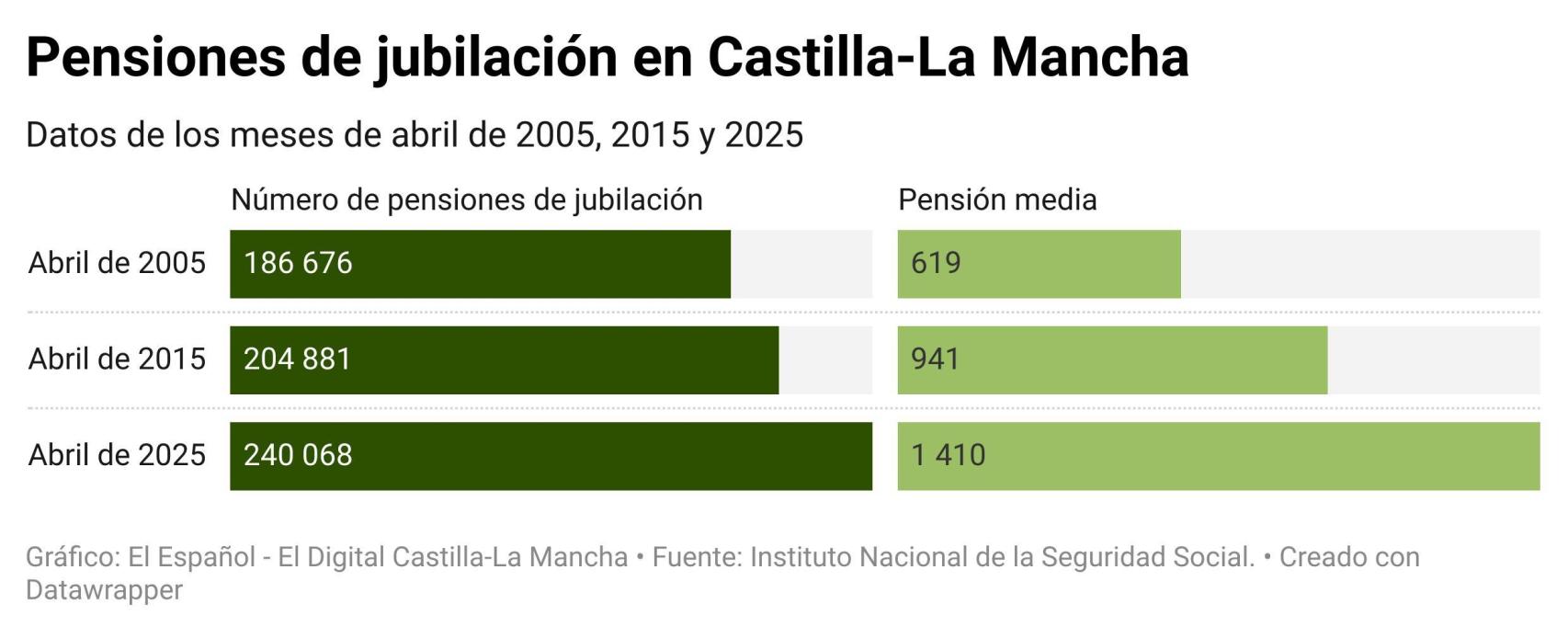 Si la analogía se establece con el dato de abril de 2015, una década antes, el crecimiento se eleva hasta el 50 %. Hace diez años, la pensión media de jubilación en Castilla-La Mancha regaba a cada beneficiario con 941 euros mensuales.