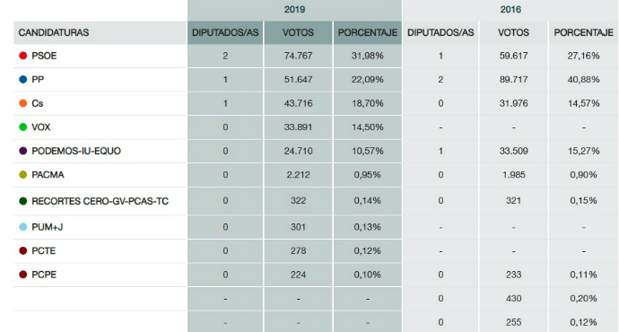 En las últimas elecciones generales, el PP se hizo con la victoria y alcanzó 2 escaños superando el 40% de voto, por uno del PSOE y otro para Podemos.
