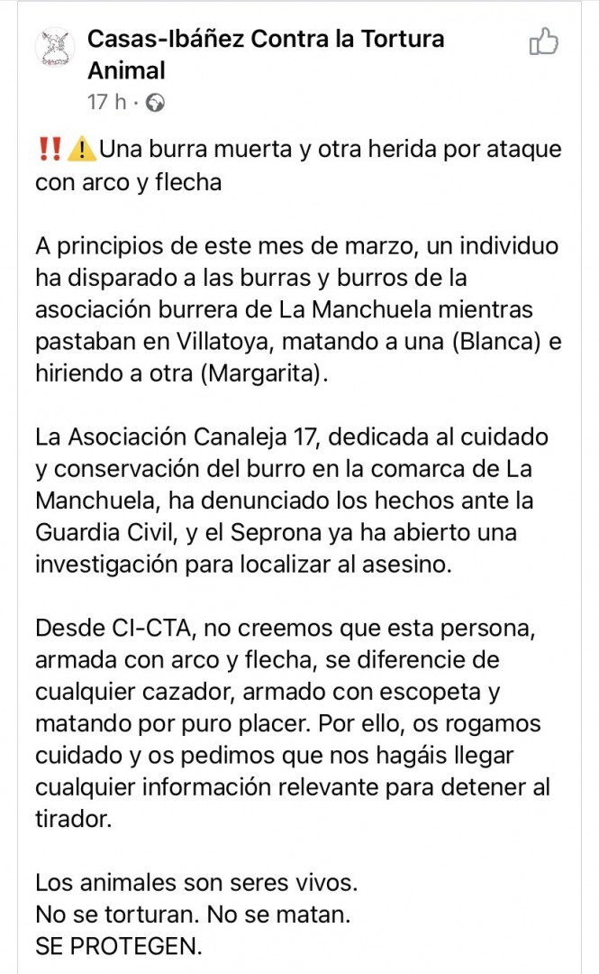 Tal como ,ha informado La Tribuna de Albacete, los hechos se produjeron a comienzos de mes, como queda reflejado en las redes sociales los colectivos Casas Ibáñez Contra la Tortura Animal y ACEM-Ecologistas de La Manchuela, que detallan que los animales atacados forman parte de la recua que cuida la Asociación Canaleja 17. Esta organización, dedicada al cuidado y conservación del burro en la comarca de La Manchuela, denunció los hechos ante la Guardia Civil de Casas Ibáñez "y el Seprona ya ha abierto una investigación para localizar al asesino".