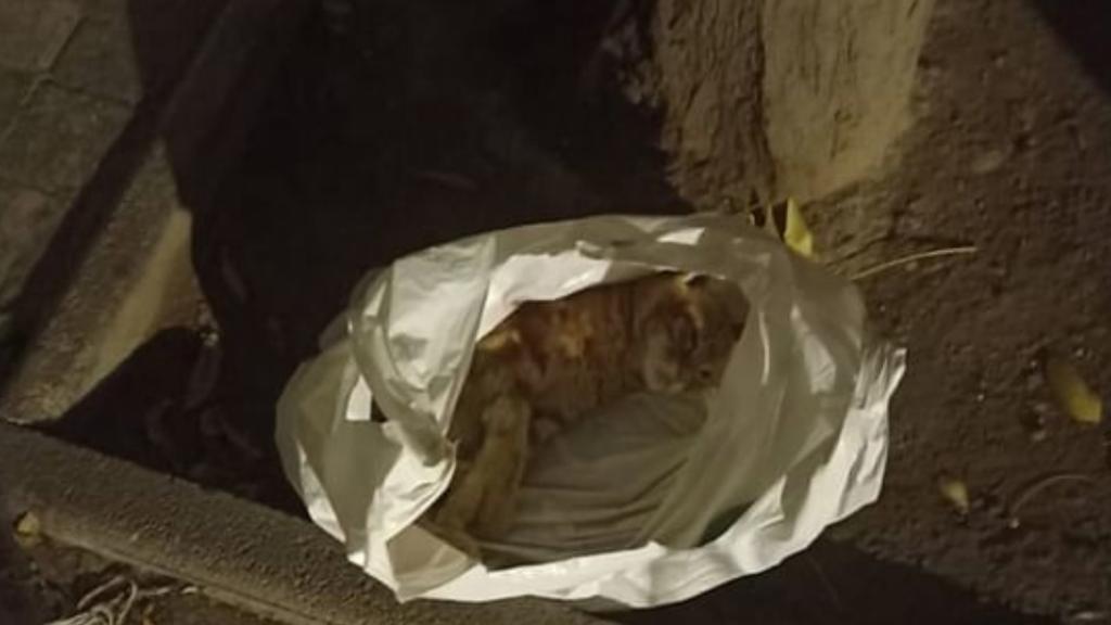 Tal y como ha informado la asociación, fue una chica la que se topó con él mientras paseaba con su perro por la calle Pérez Galdós, frente a la Clínica del Arca. El animal se paró delante de una bolsa y, ante la insistincia, la dueña decidió abrirla encontrando dentro a un gato joven "dolorido, sin poder moverse y caquéxico".