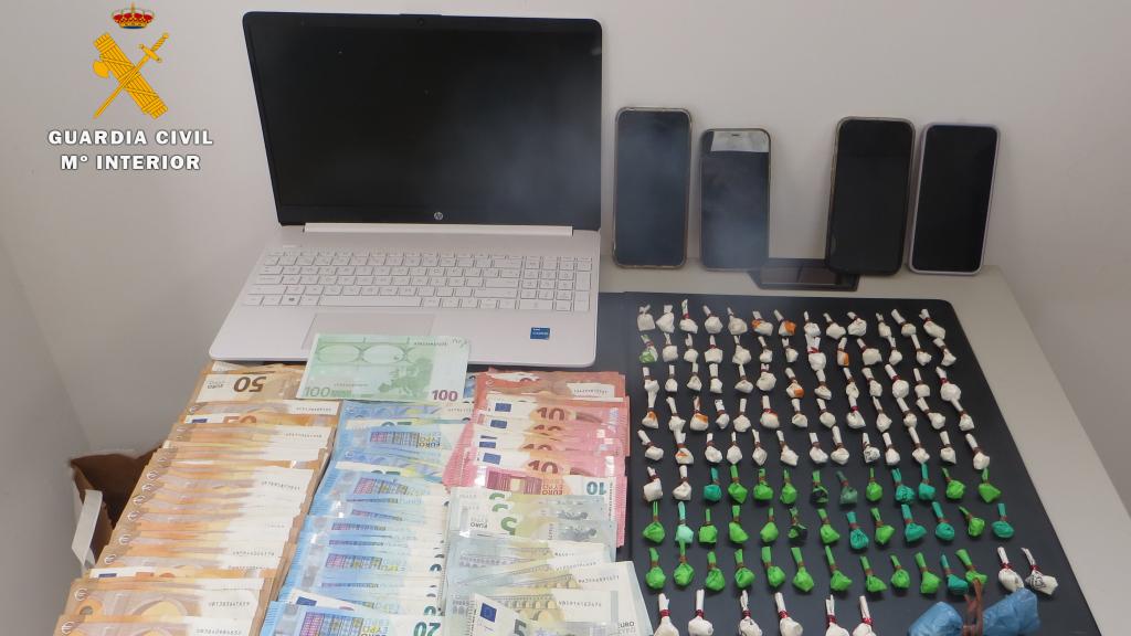 Como resultado de los registros llevados a cabo en los domicilios, la Guardia Civil intervino 107 gramos de cocaína, 3.070 euros en efectivo y documentación relacionada con el delito investigado.