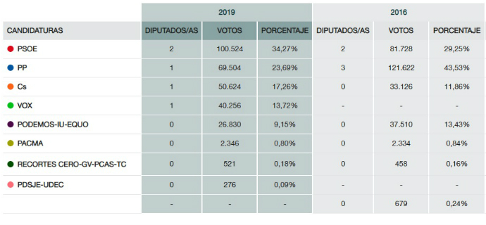 En las pasadas elecciones, el PP ganó el envite superando el 38 % de los votos y alcanzando 3 escaños, por 2 asientos conseguidos por el PSOE con un 31 % de sufragios obtenidos.
