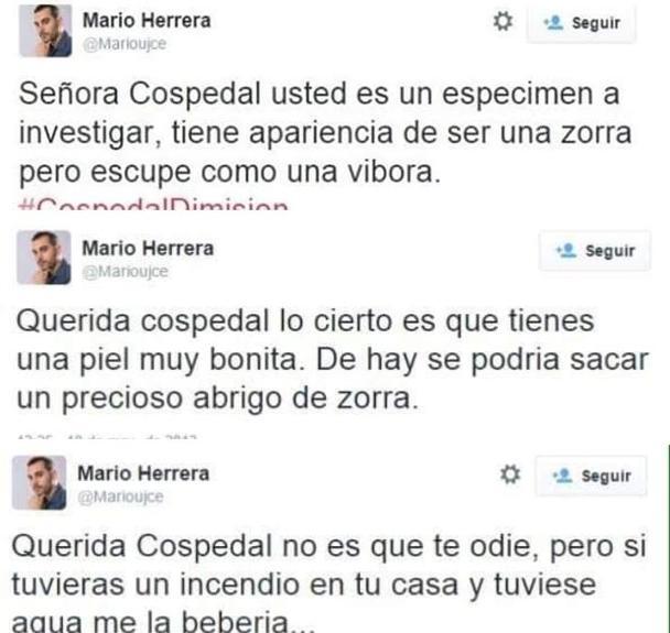 Los mensajes de Herrera eran bestialidades machistas e insultos contra la exministra de Defensa tales como "señora Cospedal, usted es un espécimen a investigar, tiene apariencia de ser una zorra pero escupe como una víbora", "Querida Cospedal, lo cierto es que tienes una piel muy bonita. De hay (sic) se podría sacar un precioso abrigo de zorra" o "Querida Cospedal no es que te odie, pero si tuvieras un incendio en casa y tuviese agua me la bebería".