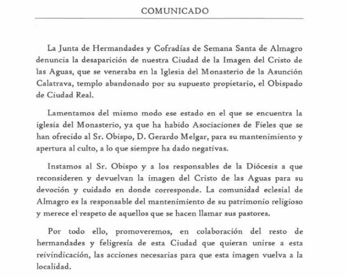Primero: Este Obispado lamenta profundamente el tono provocativo, de sospecha, populista y ofensivo que utiliza en su comunicado el Sr. Barrajón sobre el Obispo y los responsables diocesanos, quien se dice que es Presidente de la Junta de Hermandades y Cofradías de Almagro. Si D. José Antonio se hubiera dirigido a este Obispado se le hubiera podido informar del lamentable estado en que se encuentra la imagen del Cristo de las Aguas, y que a este Obispado sólo le mueve el interés de su conservación, cuidado y futura restauración. La imagen está actualmente expuesta al público en el Museo Diocesano.