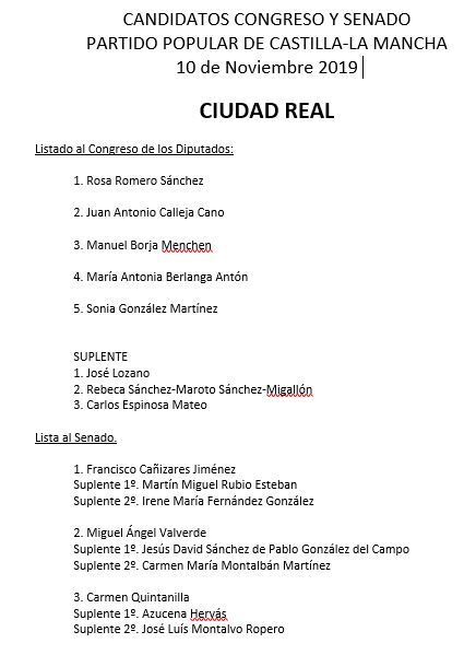 Rosa Romero repetirá como cabeza de lista del PP de Ciudad Real al Congreso de los Diputados en las elecciones generales del próximo mes de noviembre mientras que Paco Cañizares lo hará al Senado, sustituyendo en el puesto a la histórica Carmen Quintanilla, que queda relegada al puesto tres de la Cámara Alta.
