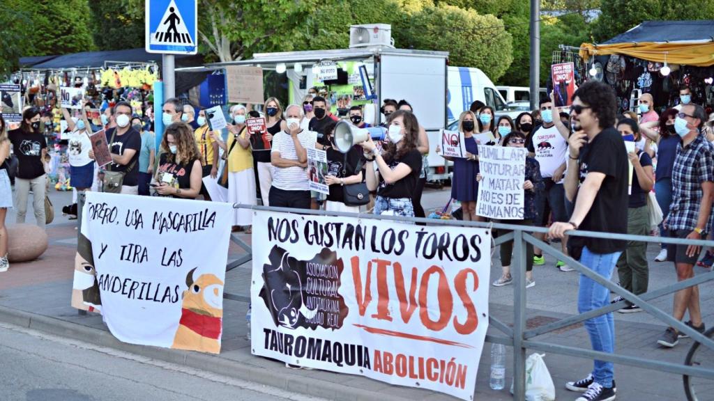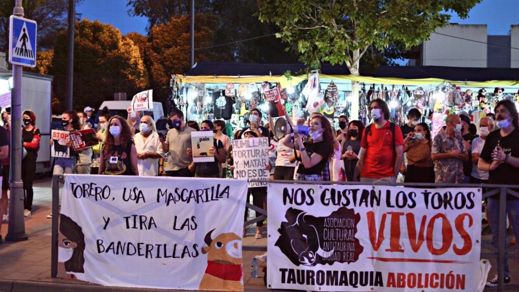 La Asociación Cultural Antitaurina de Ciudad Real (ACACR), junto con la protectora de animales y plantas Animalcazar, se manifestaron este domingo a las puertas de la plaza de toros de Alcázar de San Juan, donde se celebraba una corrida en esos mismos instantes, bajo el lema "la tauromaquia necesita una vacuna: la abolición".