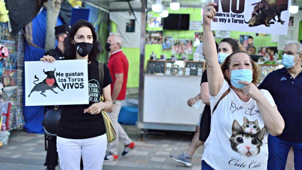 Algunos de los lemas que gritaron los manifestantes mientras salían los espectadores del coso son "aquí estamos, nosotras no matamos", "sí a los toros, vivos y libres" o "Alcázar avanza, tu tradición espanta".