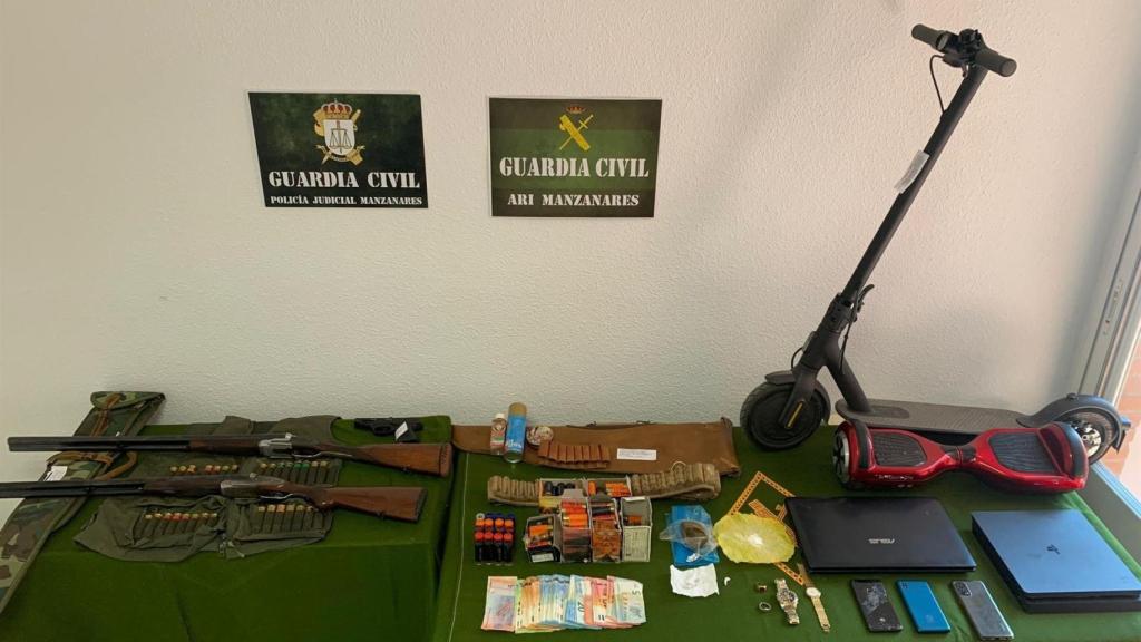 Después de estas nuevas averiguaciones, se autorizó por parte de la autoridad judicial la entrada y registro en dos domicilios de la localidad de Manzanares, en los que se recuperaron objetos sustraídos, diferentes sustancias estupefacientes, dinero, joyas de elevado valor, así como armas de fuego junto con cartuchería, siendo detenidas dos personas más a la finalización de las actuaciones.