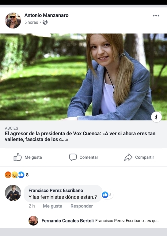 El lunes noche comenzó a difundirse por redes sociales la noticia de que había sufrido una agresión física a raíz de las elecciones del 26M y como 'presidenta de Vox Cuenca'. Esa noticia es de agosto de 2015.