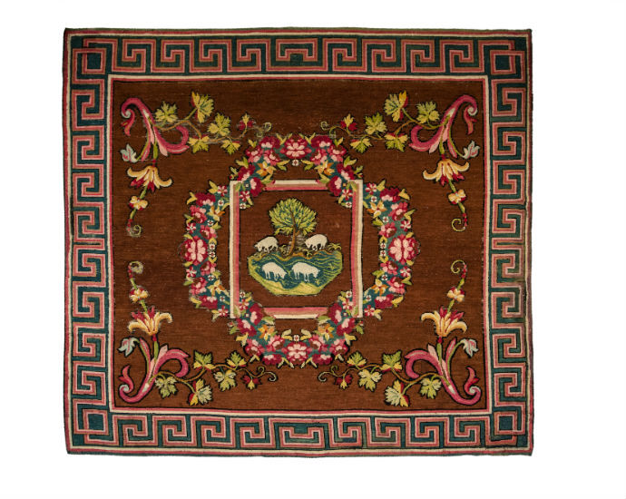 En el centro, resaltar un medallón en el que se representa un pino y cuatro ovejas, que hace a esta alfombra única, puesto que viene a demostrar que fue un diseño exclusivo y personalizado para la Hermandad de Nuestra Señora del Pinar de Cañaveras.