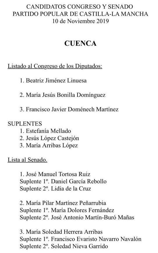 Sorpresa en las listas electorales del PP en Cuenca, provincia en la que Beatriz Jiménez Linuesaencabezará la candidatura de este partido al Congreso de los Diputados en las elecciones generales del próximo mes de noviembre. Como número dos repite la exalcaldesa de Tarancón María Jesús Bonilla.