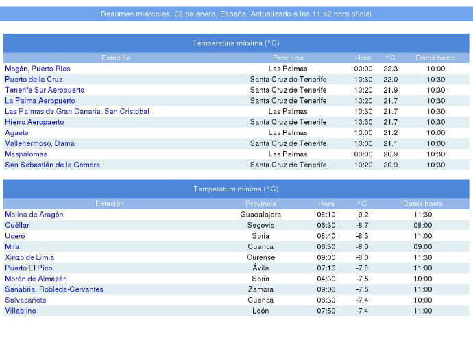 El cuarto registro más bajo de esta noche se ha producido en Xinzo de Limia (Ourense), con 8 grados bajo cero a las 7.10 horas, mientras que en Morón de Almazán (Soria) los termómetros han bajado hasta los -7,5 grados a las 4.30 horas, el mismo registro que se ha alcanzado en Mira (Cuenca) a las 5.00 horas.
