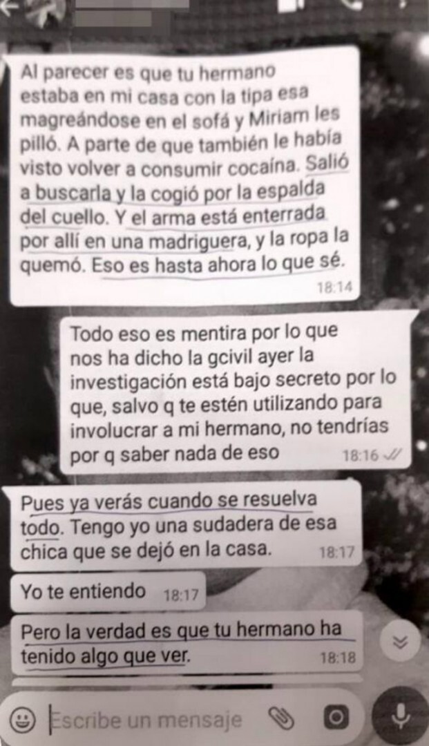 En concreto, Celia escribe lo siguiente: "Al parecer tu hermano estaba en mi casa con la tipa esa magreándose en el sofá y Miriam les pilló. A parte de que también le había visto volver a consumir cocaína". El relato escrito en el móvil sigue de la siguiente forma: "Salió a buscarla y la cogió por la espalda del cuello. Y el arma está enterrada por allí en una madriguera y la ropa la quemó. Eso es hasta ahora lo que sé". Por su parte, el hermano del presunto asesino le contesta a Celia de esta forma: "Todo es mentira por lo que nos ha dicho la Guardia Civil ayer la investigación está bajo secreto de sumario por lo que salvo que te estén utilizando para involucrar a mi hermano, no tendrías que saber nada de eso".