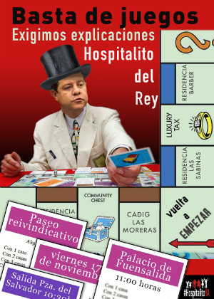 Los integrantes de la plataforma realizarán, anteriormente, un paseo reivindicativo que comenzará a las 10:30 horas desde la plaza del Salvador . A la llegada al Palacio de Fuensdalida, entregarán un escrito dirigido al presidente del Gobierno regional, Emiliano García-Page, al que han puesto una chistera en el cartel anunciador de esta iniciativa de protesta. "Basta de juegos. Exigimos explicaciones", reza el cartel inspirado en el clásico juego de mesa Monopoly, basado en la especulación inmobiliaria.
