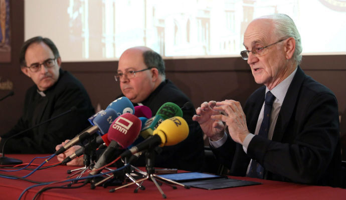 Han acompañado al deán el canónigo obrero de la Catedral, Francisco Javier Hernández, y el arquitecto conservador del templo, Jaime Castañón, que han explicado con detalle las inspecciones y análisis realizados desde que la pieza de la cornisa cayó el suelo y en qué va a consistir la restauración.