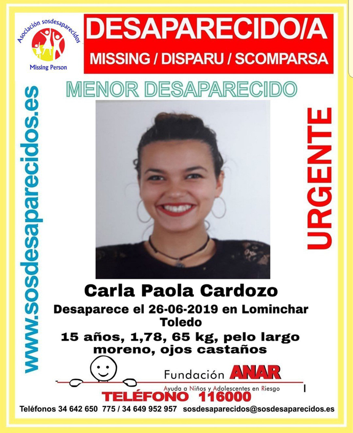 Una menor ha desaparecido tras ser vista por última vez en la provincia y, después de una semana sin conocer su paradero, se la están buscando a través de los canales dedicados a este tipo de tareas. Así se ha informado por medio de SOS Desaparecidos y la Fundación ANAR, donde se revela que la identidad de la joven es Carla Paola Cardozo.