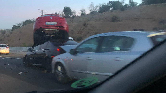 Un aparatoso accidente múltiple ocurrido pasadas las 7:30 horas de este jueves en la conocida como Bajada de Las Nieves, que da entrada a Toledo desde la Autovía de Los Viñedos, ha dejado a cinco vehículos implicados, uno de ellos una motocicleta.